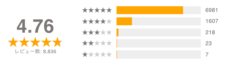 77%以上の方が「星5」、97%以上の方が「星4」の高評価をつけていることから分かりますが、実際の利用者の満足度はかなり高いです。