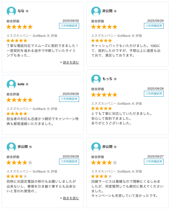 私たち専門家から見ても、キャッシュバック額・サポート体制・口コミ評価のどれをとっても申し分なく、ソフトバンク光を検討中の方はエヌズカンパニーがベストだと断言できます。